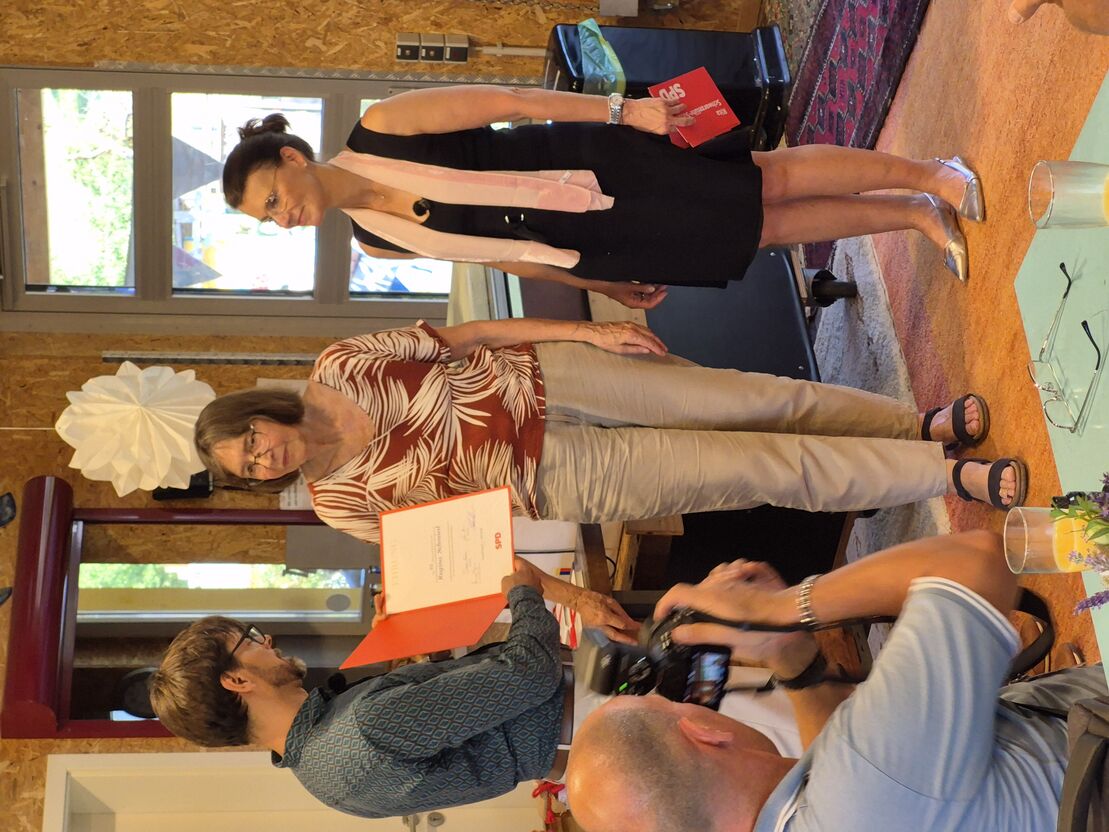 Andrea Timm und Ingrid Pichler haben sich in unterschiedlichen Lebensphasen vor zehn Jahren entschieden, Mitglied in unserer Partei zu werden. In einer Zeit, in der es leichter möglich ist, kurzfristig als Influencer:in tausende Follower hinter sich zu scharen, ist ein Bekenntnis zu einer demokratischen Partei durch Mitgliedschaft ein Ausdruck einer klaren Wertehaltung. Philipp Schmidt-Wellenburg war immer noch beeindruckt, dass sich Andrea Timm relativ schnell überreden ließ, den nicht trivialen Job der Kassiererin zu übernehmen. Als noch-JUSO sei sie gerade ein Vorbild für die junge Generation. Ingrid Pichler sei in höherem Alter zur SPD gestoßen und neben der SPD z.B. seit längerer Zeit im Helferkreis aktiv. Für sie sei es typisch, dass sie immer im Hintergrund aktiv und engagiert helfe, wenn Hilfe gebraucht werde, sie sich dabei aber nie in den Vordergrund schiebe.